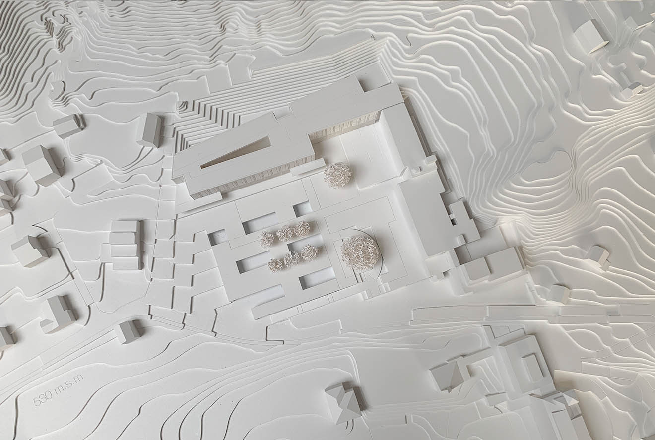 面对陡峭的山体与开阔的山谷,新的建筑体量沿南北轴线顺势展开,北侧与旧的老年之家连接,避开视线遮挡,释放出东向的开放界面,使花园与山谷景观自然融合。