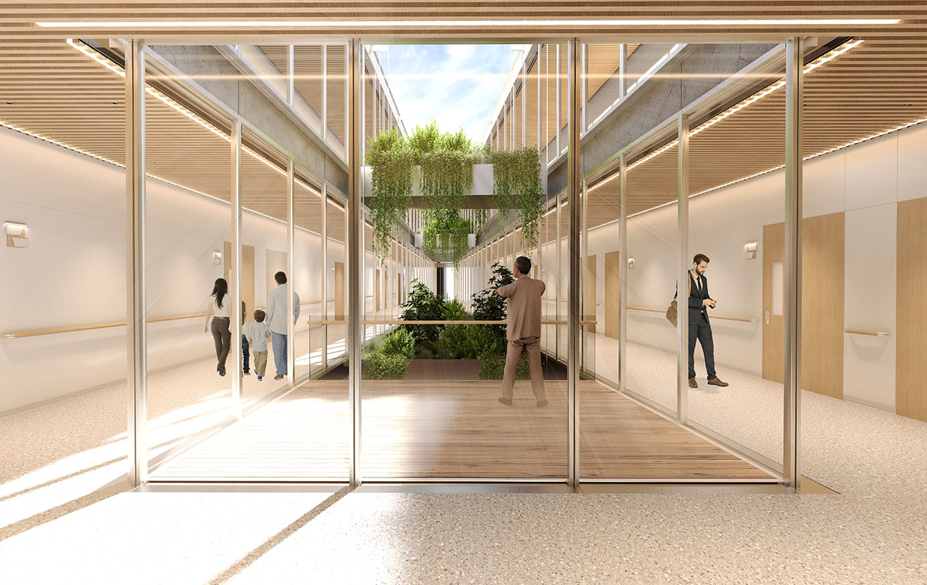 建筑由数个体块错动构成,向天空开放的内庭院引入了阳光与绿意。走廊在体块之间柔和延展,串联起不同的功能空间,也鼓励人们在穿行中与自然发生关系。光线、空气和植被成为空间的核心元素,与使用者的日常活动产生互动。